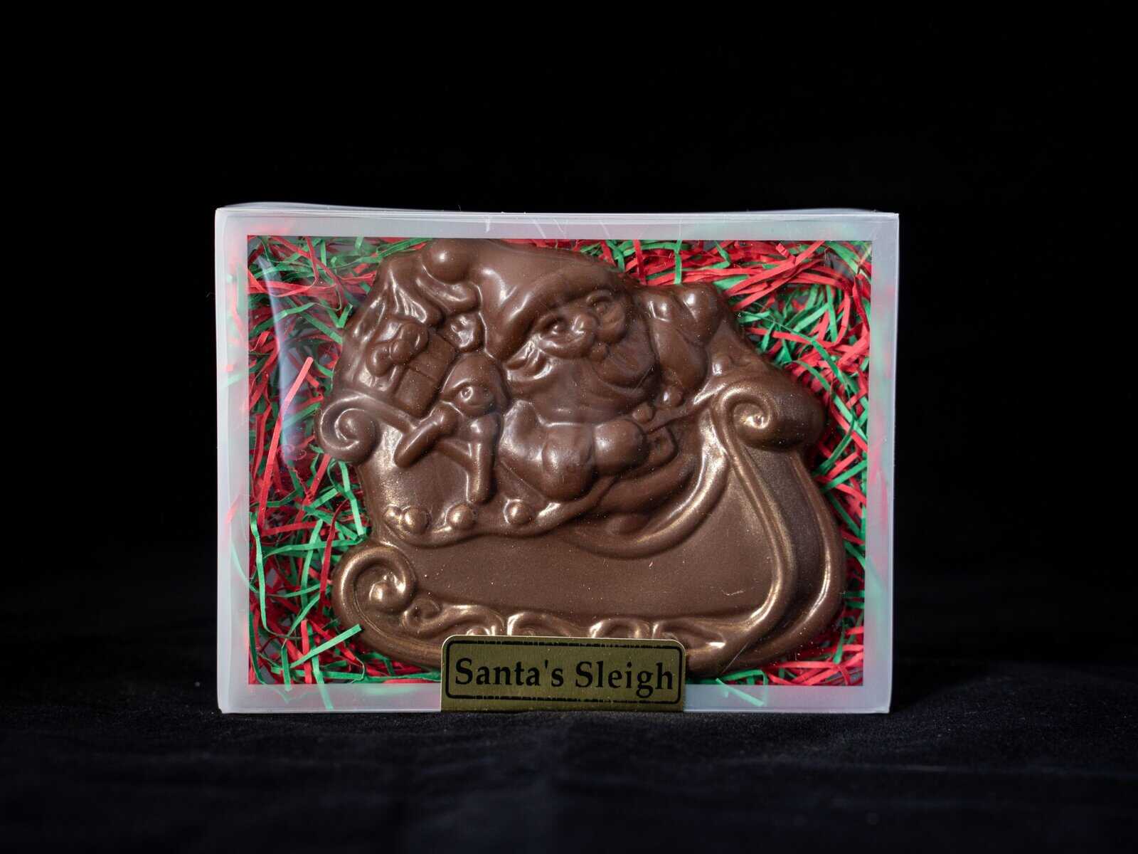 Santa’s Sleigh is loaded up and ready to fly! Available in Dark, Milk or White Chocolate, with decorative shimmer. 3.5oz each